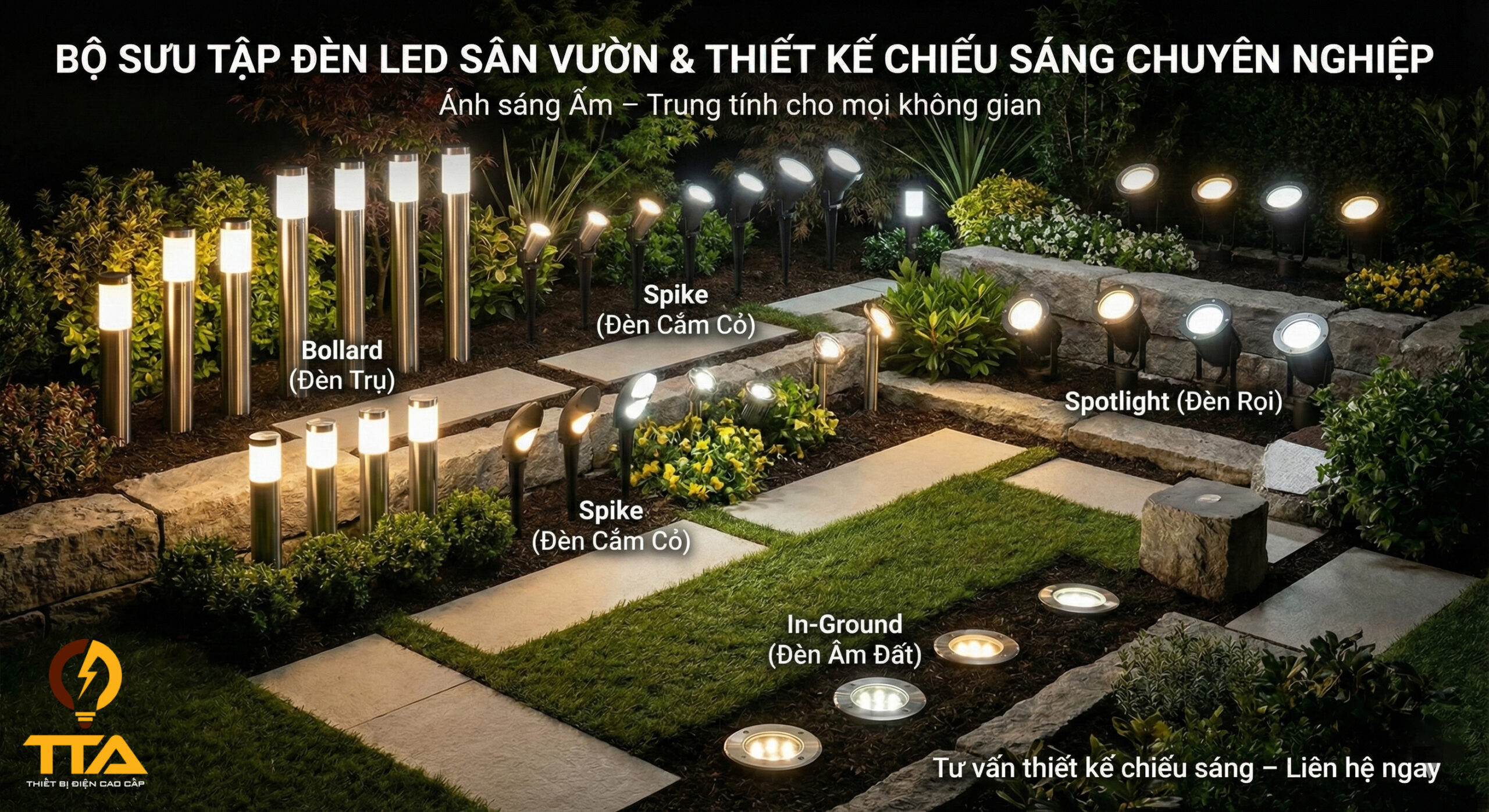 🔸 Thiết kế phù hợp tổng thể sân vườn: bollard, cắm cỏ, rọi, âm đất, mỗi dạng có ưu thế riêng.