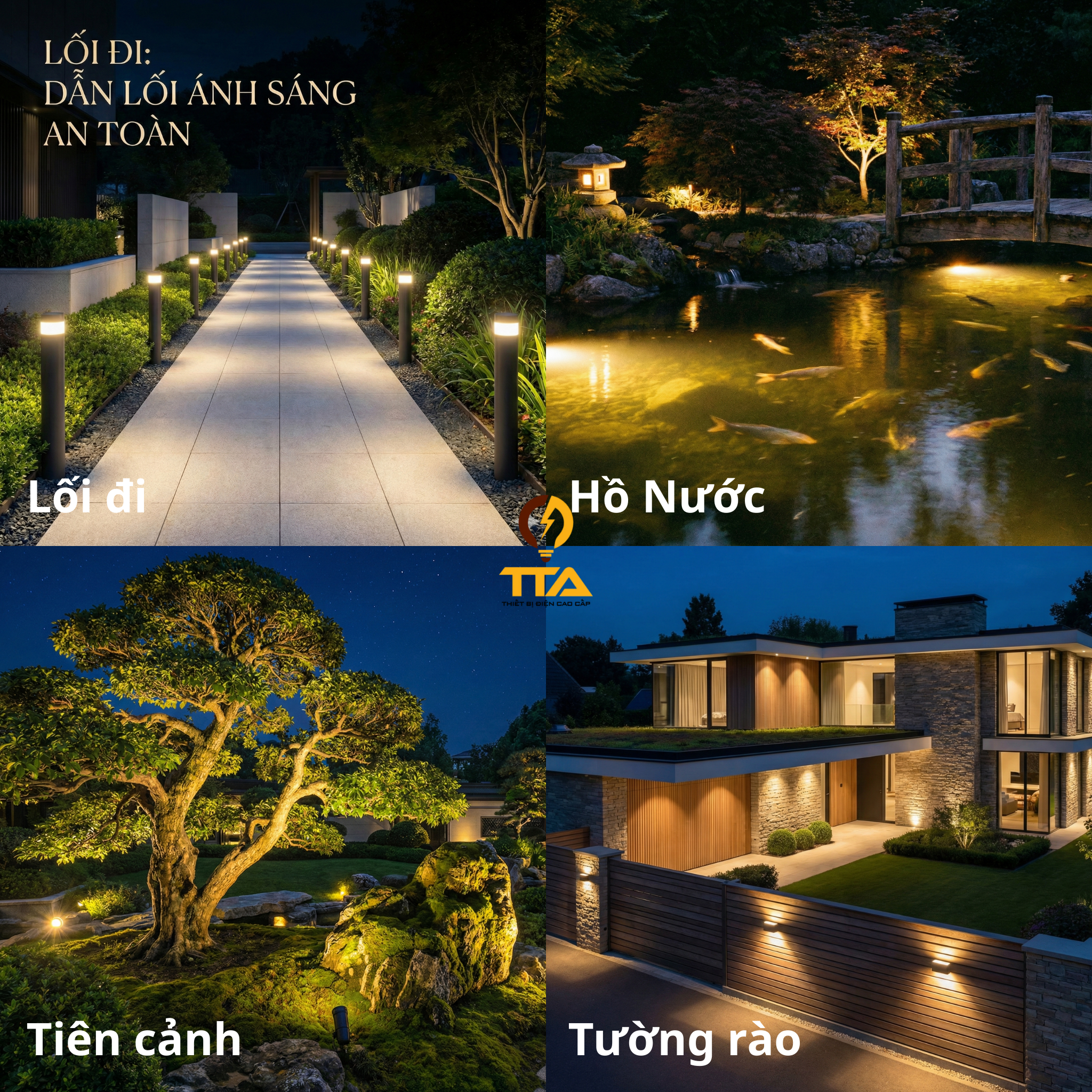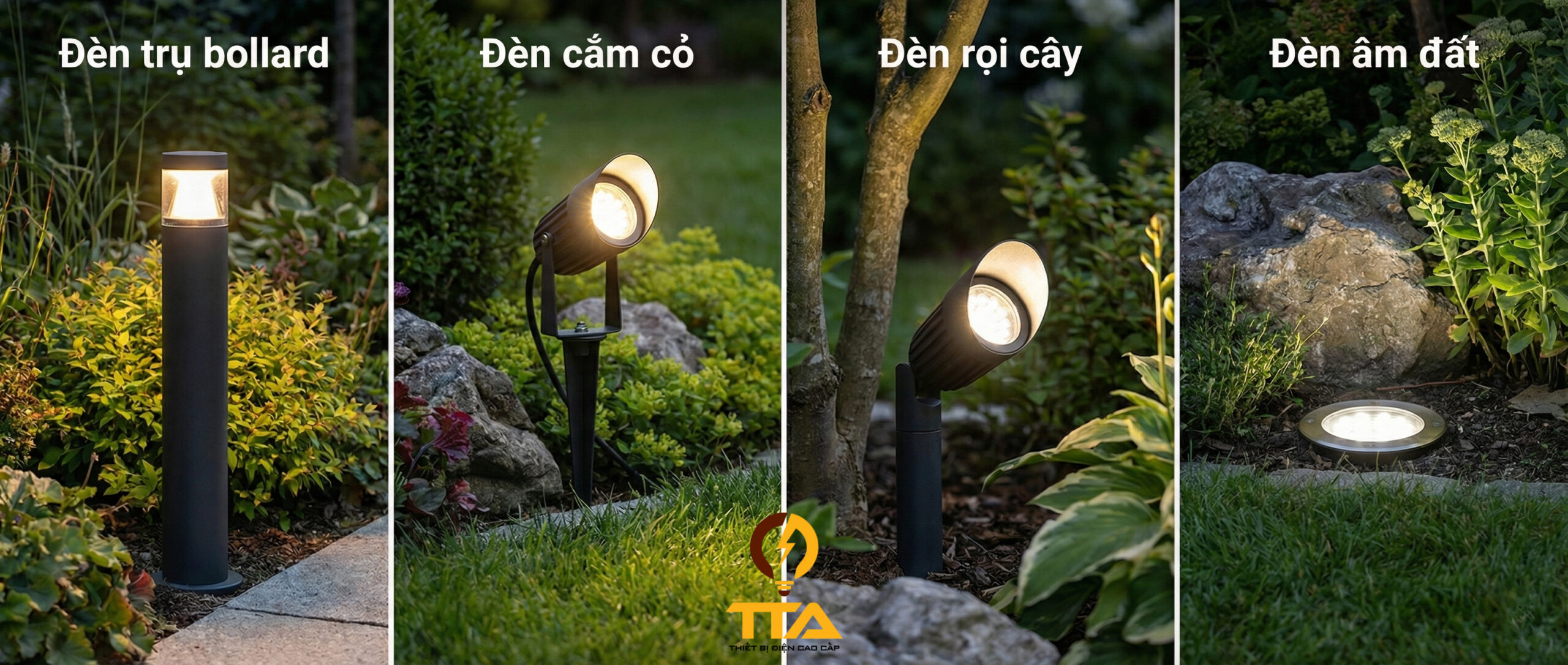 - Đa dạng mẫu mã: từ đèn cắm cỏ, đèn trụ cảnh quan đến đèn rọi và đèn tường, dễ kết hợp mọi phong cách sân vườn.