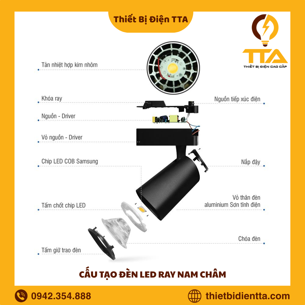 Đầu đèn LED (spotlight): Có thể gắn hoặc tháo rời khỏi thanh ray, với khả năng xoay, nghiêng linh hoạt.