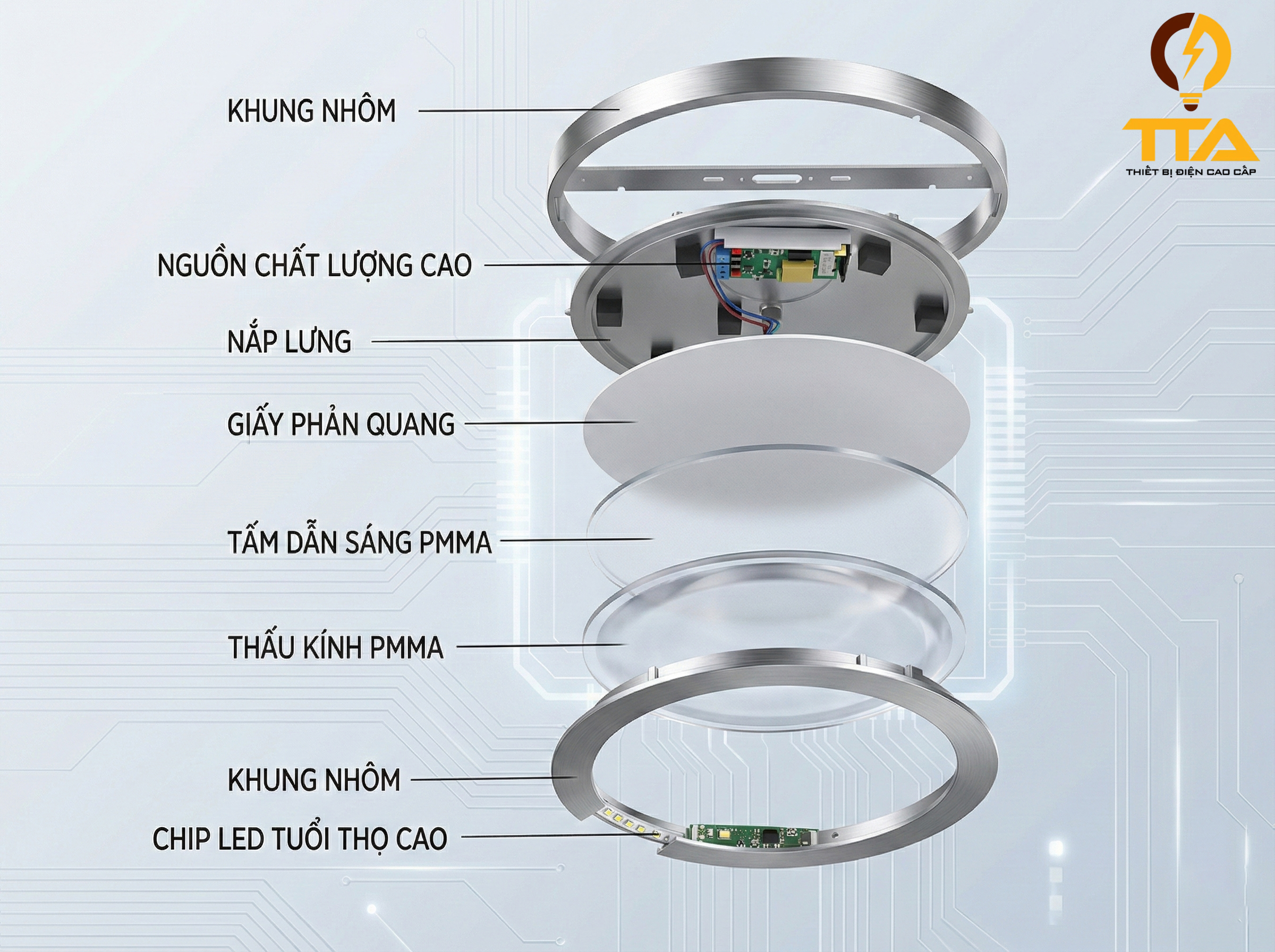 Một chiếc đèn ốp trần LED thường gồm các bộ phận chính: