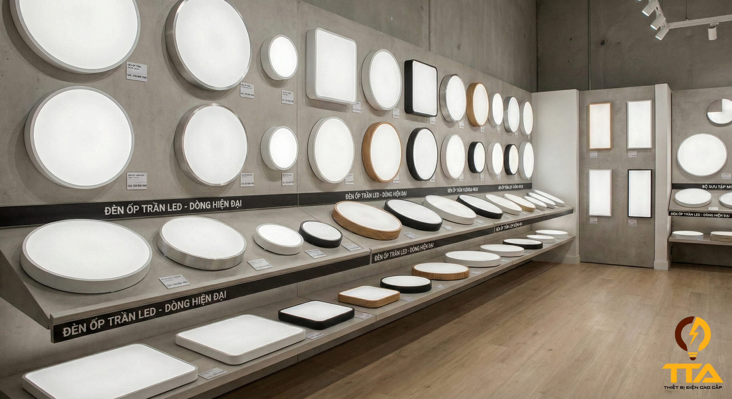Đèn ốp trần có nhiều kiểu dáng: tròn, vuông, hoa văn, với các mức công suất từ thấp đến cao phục vụ mọi nhu cầu chiếu sáng.