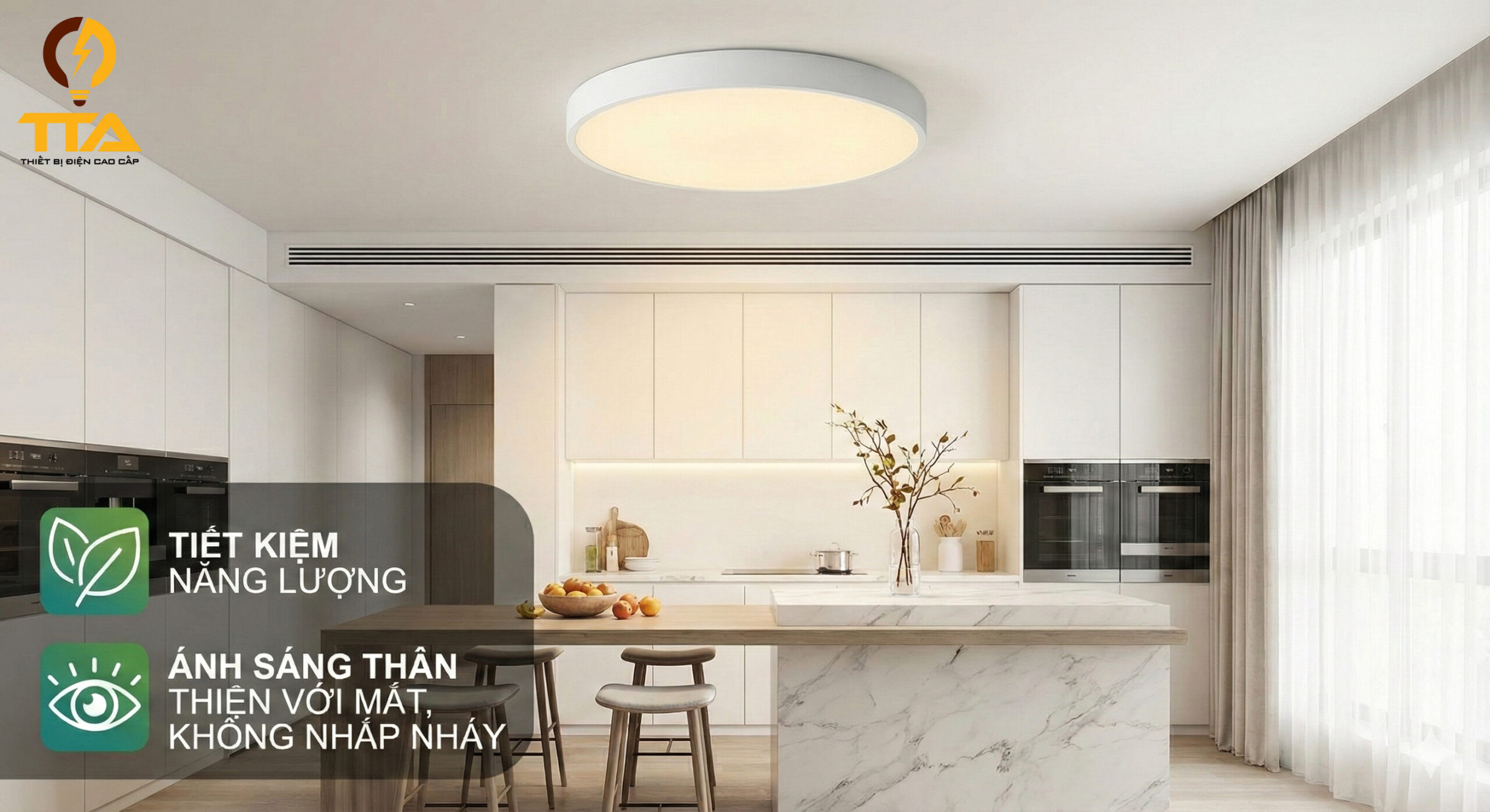 Đèn ốp trần sử dụng công nghệ LED giúp tiêu thụ điện thấp hơn so với đèn sợi đốt và huỳnh quang, có thể tiết kiệm đến 70–80% điện năng.