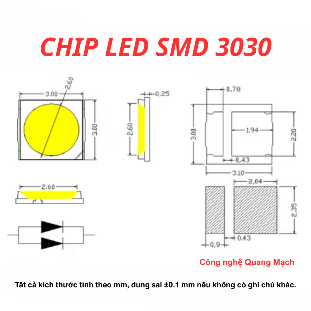 Chip LED SMD 3030 là loại Surface Mounted Diode (đi-ốt gắn bề mặt) với kích thước 3.0 x 3.0 mm. Đây là loại chip có khả năng phát sáng mạnh, độ ổn định cao và thường được sử dụng trong các sản phẩm chiếu sáng công suất lớn.