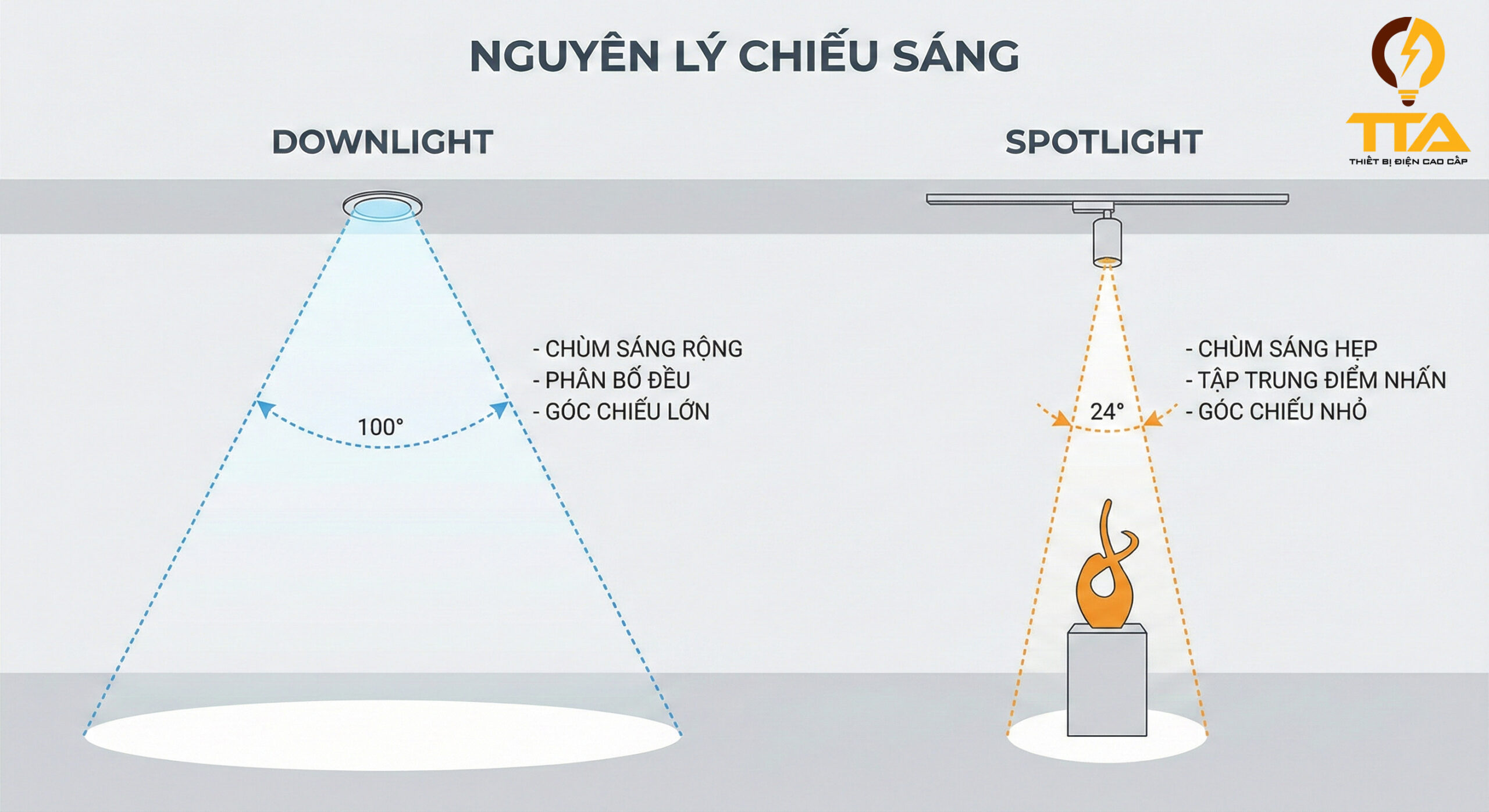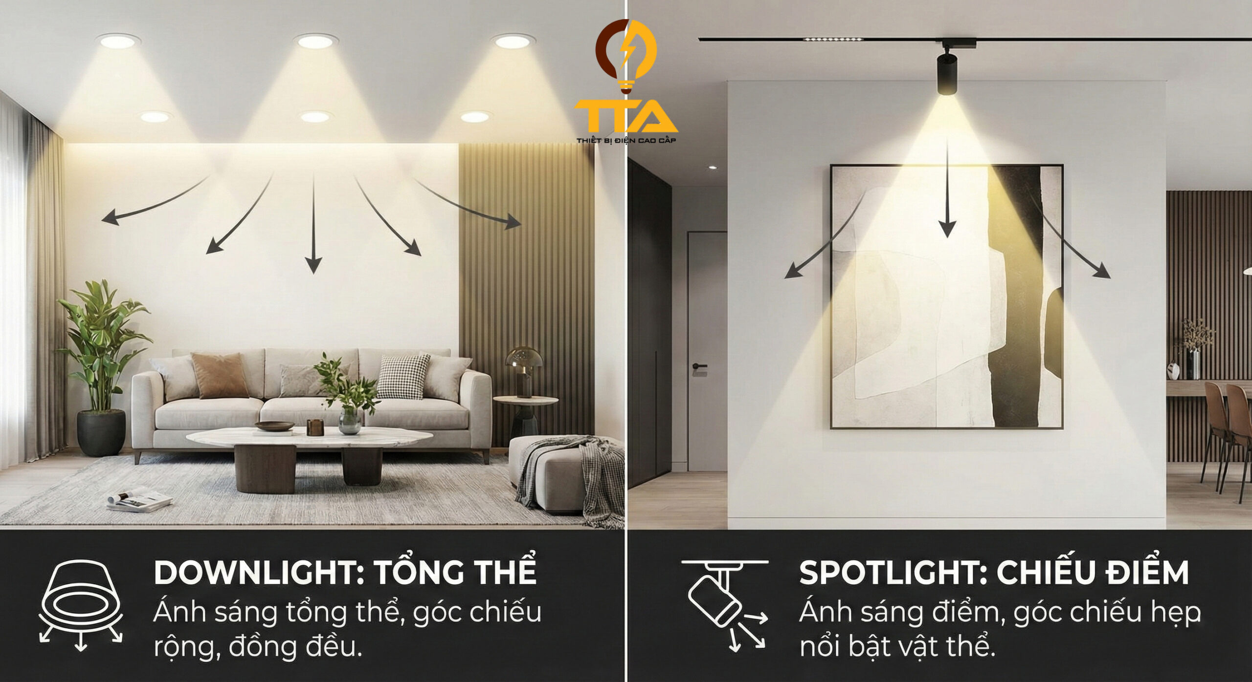 Vậy SpotlightDownlight khác nhau như thế nào? Nên sử dụng ra sao để đạt hiệu quả chiếu sáng tối ưu? Hãy cùng Thiết bị điện TTA tìm hiểu chi tiết trong bài viết dưới đây.